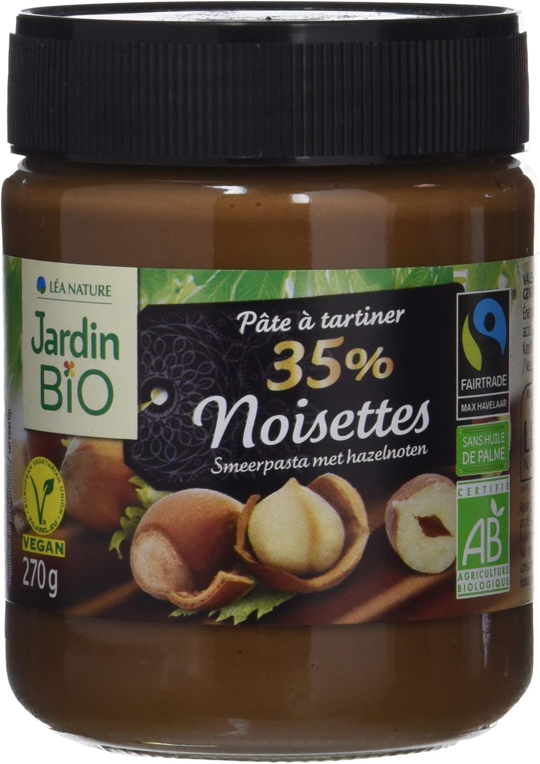 Pâte à tartiner au chocolat et aux noisettes et biosucre de canne*, huile de tournesol*, chocolat* 16,5% (sucre de canne*, poudre de cacao maigre*, beurre de cacao*), purée son délicieux goût de noisette et de chocolat fait de la pâte à tartiner jardin bio', sans huile de palme, le régal des gourmands.